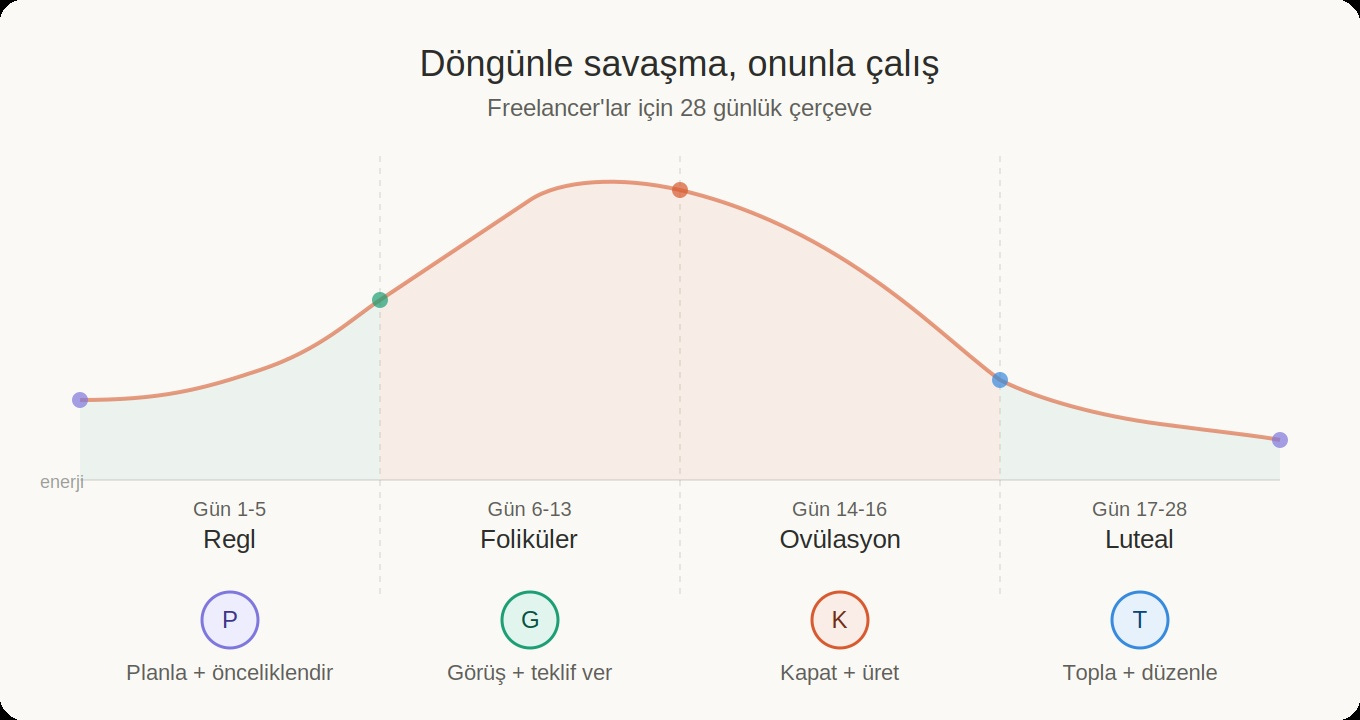 Luteal faz (ovülasyondan bir sonraki regle kadar): Toparlama moduna geçiyorum. Düzenleme, idari işler, dosyaları organize etme, ayın gevşek uçlarını bağlama. Odak gerektiren ama mutlaka zirve karizma gerektirmeyen işler. Enerjim düşüyor ve buna karşı savaşmak yerine, enerjime uyan görevler veriyorum kendime.