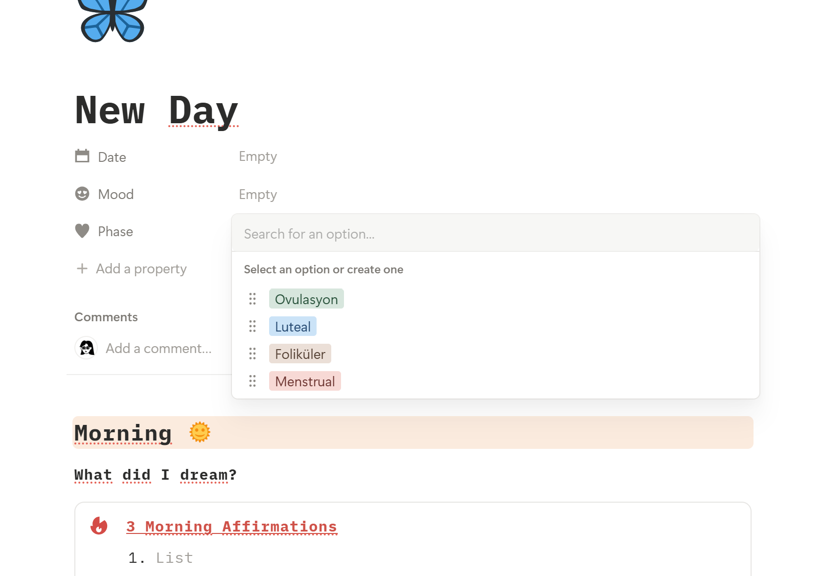 Notion’da bir günlük oluşturdum ve mevcut döngü fazım için özel bir alan (property) ekledim. Her gün hangi fazda olduğumu, enerji seviyemi, ruh halimi ve ne yaptığımı kaydediyorum. Zamanla bu bana vücudumun ve beynimin ay boyunca nasıl tepki verdiğine dair gerçek veri sağlıyor.